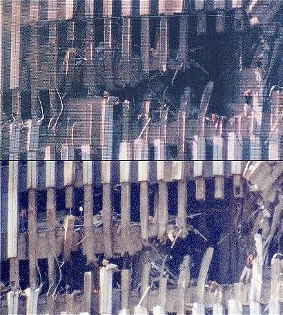 На этих двух снимках в дыре, образовавшейся в Южной Башне после того, как в здание врезался самолёт, можно разглядеть стоящую на краю женщину. Её зовут Эдна Клинтон и, как не удивительно, она оказалась в списках выживших. Как ей это удалось – уму непостижимо, учитывая всё произошедшее в той части здания.