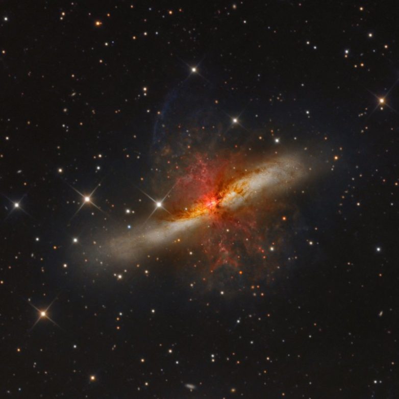 Звездная галактика M82, также известная как галактика Сигара, излучает свет в пять раз ярче, чем наша, и находится на расстоянии около 12 миллионов световых лет от Земли в созвездии Большая Медведица.