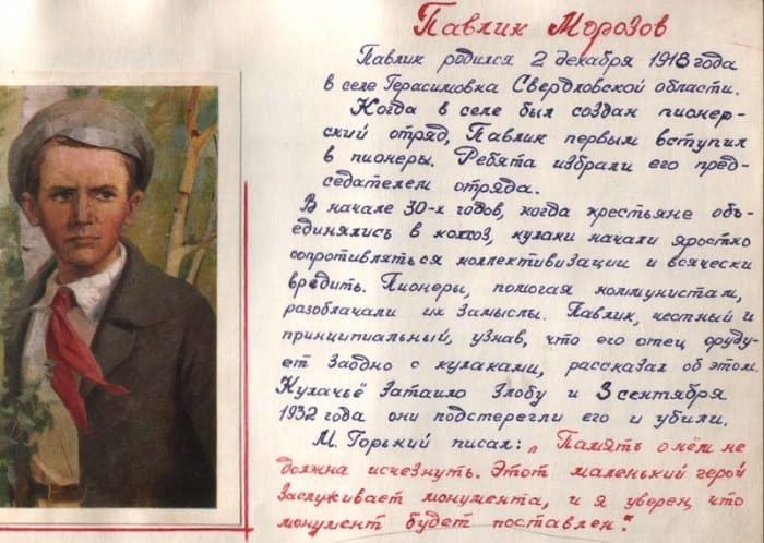 Эта история произошла в начале сентября 1932 г. в селе Герасимовка Тобольской губернии. Бабушка отправила внуков за клюквой, а через несколько дней тела братьев со следами насильственной смерти обнаружили в лесу. Федору было 8 лет, Павлу – 14. Согласно канонической версии, общепринятой в СССР, Павлик Морозов был организатором первого пионерского отряда в своей деревне, а в разгар борьбы с кулачеством донес на своего отца, который сотрудничал с кулаками. В результате Трофима Морозова отправили в 10-летнюю ссылку, а по другим источникам – расстреляли в 1938 г.