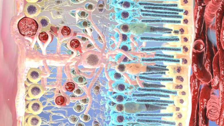 Видно как хориоидеа (справа), так и клетки глии и клетку Мюллера. Ну и фоторецептивные клетки — палочки и колбочки.