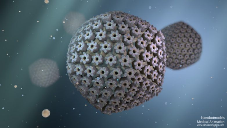 Вирус папилломы человека и то, как он приводит к раку, — кадр из анимации. Мы видим, как белок вируса присоединятеся к участку нормальной ДНК человека и приводит к ее мутации. Результат мутации — образование раковой клетки при последующем делении инфицированной.