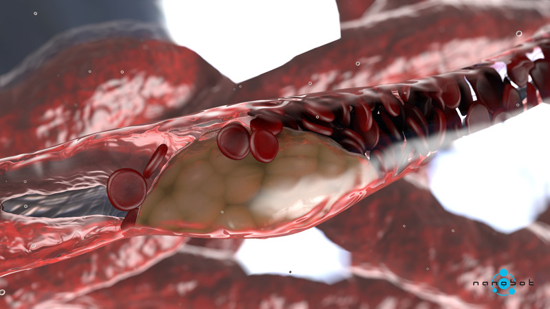 Самый обычный тромб, образовавшийся от закупорки сосуда атеросклеротической бляшкой. Эритроциты очень гибкие и могут проходить в сосуды диаметром 4 микрона, хотя сами в диаметре 7 микрон.