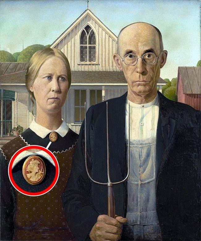 Обратите внимание на брошь: на ней изображена Персефона, древнегреческая богиня плодородия и царства мертвых. По легенде, Персефону похитил Аид, а вилы в руках фермера как раз похожи на вилы, которые держал в руках древнегреческий бог царства мертвых. Грант Вуд спрятал много деталей: например, отстрочка на джинсовом комбинезоне, полосы на рубашке, рамы окон и даже растение на заднем плане копируют очертания вил.