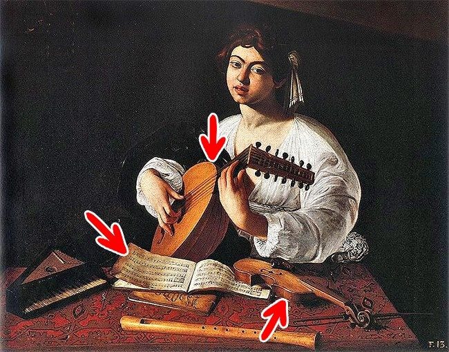 © wikipedia Долгое время картина носила название «Лютнистка», и только в начале ХХ века искусствоведы разглядели в изображенном человеке юношу. На то, что это молодой человек, указывают несколько признаков: на нотах видна запись басовой партии мадригала Якоба Аркадельта «Вы знаете, что я люблю вас», а также лютня и скрипка, считавшиеся в эпоху Караваджо мужскими инструментами.