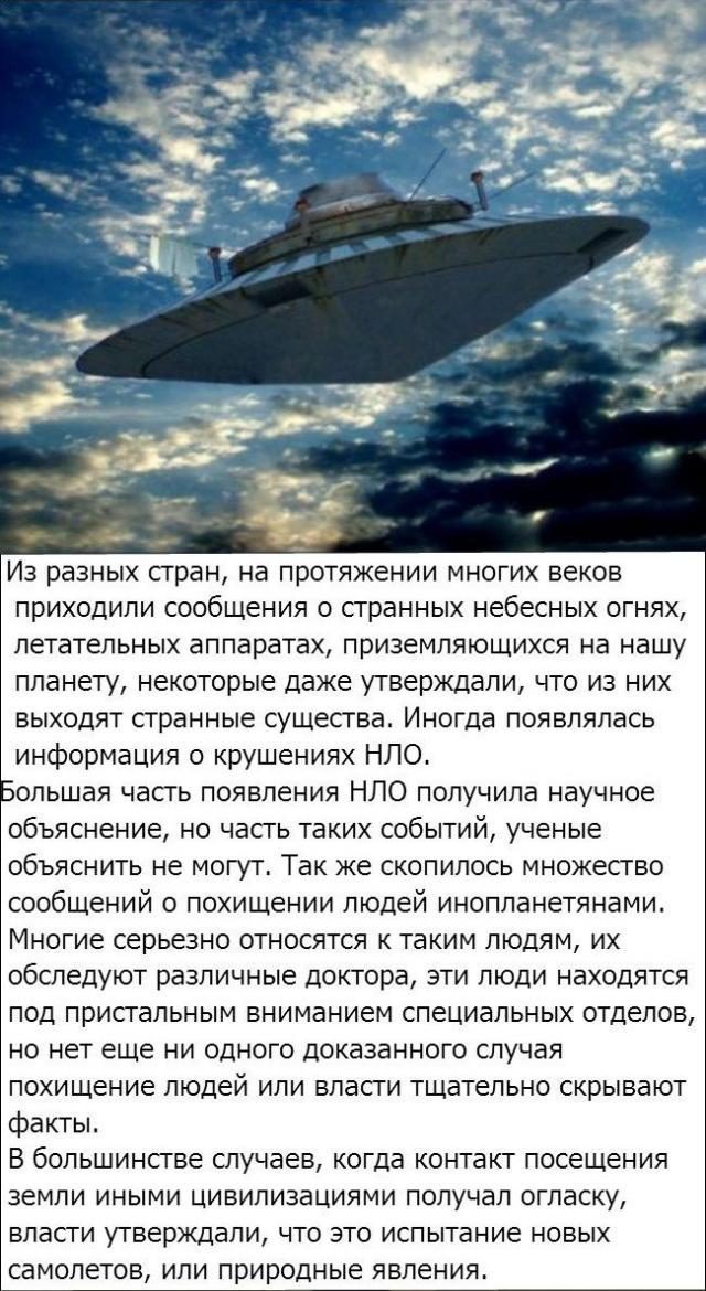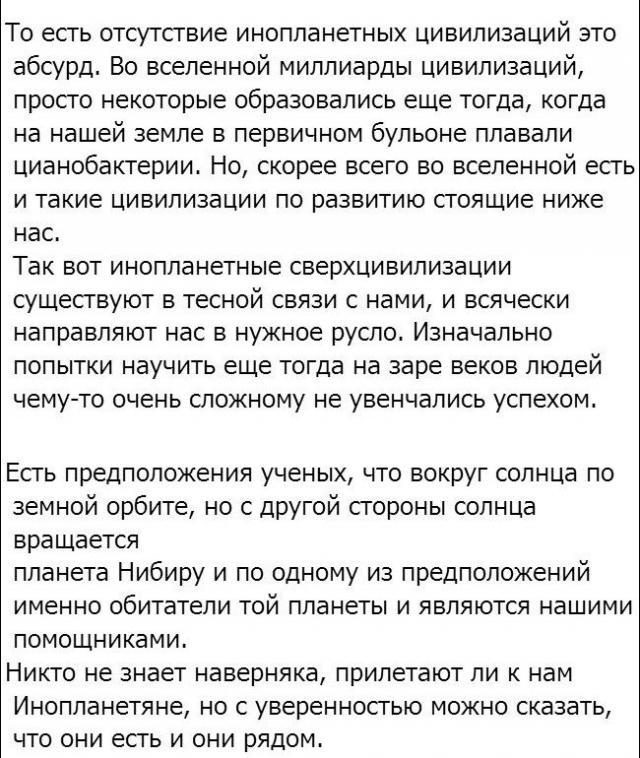 Я скорее могу допустить, что мы видим посетителей из будущего. Возможно мы виртуалы в чьей-то великой игре. Я сам видел в небе нечто необьяснимое. Но, по моему мнению — мы во Вселенной одни. Только представьте, как Творец намучился создавая Землю, жизнь на ней и нас грешных! Ему даже приходилось обходить законы созданные им же. Возьмите для примера воду, которая ведет себя совсем не так как другие жидкости. И таких примеров — масса.