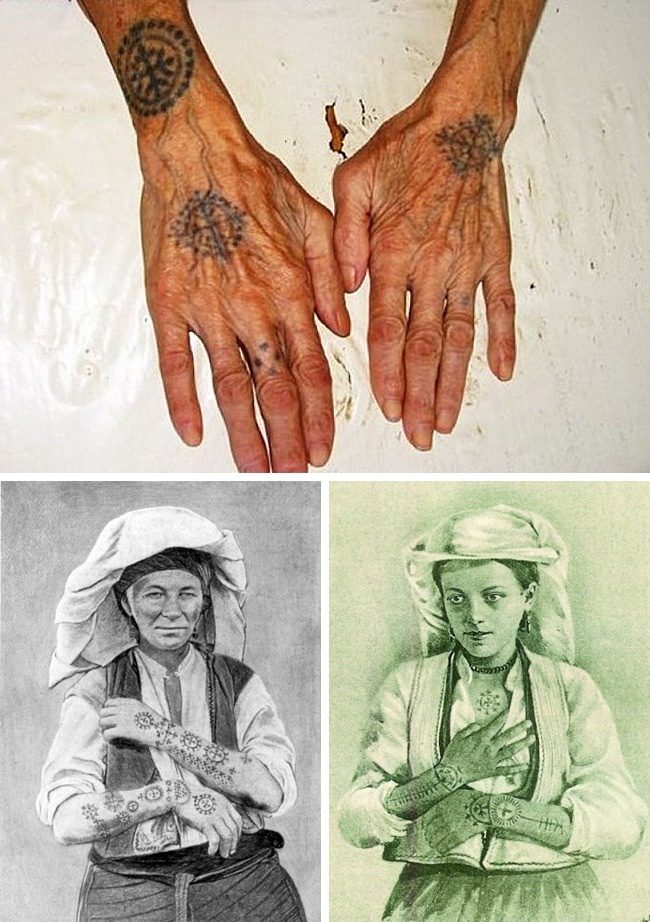 Не удивляйтесь, если вы приедете на Балканы и встретите татуированных бабушек.Кое-где в Боснии, Хорватии и Албании женщины издревле носили на руках татуировки с солярными символами. Эти узоры восходят к языческому прошлому балканских славян и имеют значение оберегов. Наносили их в дни весеннего равноденствия. Дополнительным плюсом таких тату было то, что девушек, украшенных ими, турки не угоняли в гаремы.