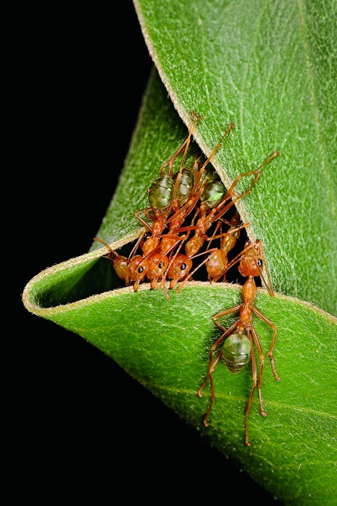 Для строительства своих гнёзд муравьи-ткачи используют мощные челюсти, которыми они срезают листья, а затем скрепляют их шелковыми нитями, которые производят их личинки.