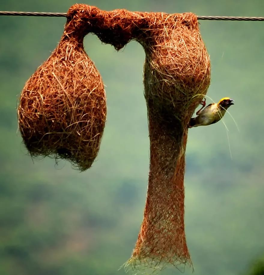 Маленькая птичка строит себе гнездо из длинных, только что сорванных, гибких травинок. Солнце высушивает травинки, благодаря чему они затвердевают, превращая гнезда в прочные строения, в которые можно попасть только через отверстие внизу.
