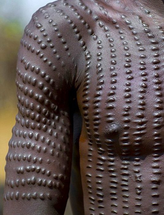 В Западной Африке распространено такое явление, как «шрамирование», или «скарификация». Татуировки там не получили распространения, т. к. из-за темного цвета их попросту не видно. Тогда африканцы пошли другим путем: они стали делать на своих телах орнаменты из надрезов. Для этого использовался любой острый предмет. В образовавшуюся ранку втирали золу или сок фруктов, которые препятствовали ее заживлению.