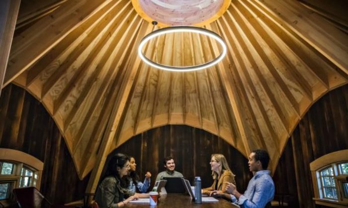 Помещение офиса выполнено из натуральной древесины с куполом, сквозь который проходит естественный свет. Если сотрудники не желают решать задачи компании в помещении, они с удобством могут расположиться на открытой площадке из кедровых досок. Руководство компании считает, что свежий воздух и нестандартный подход повысят производительность сотрудников.