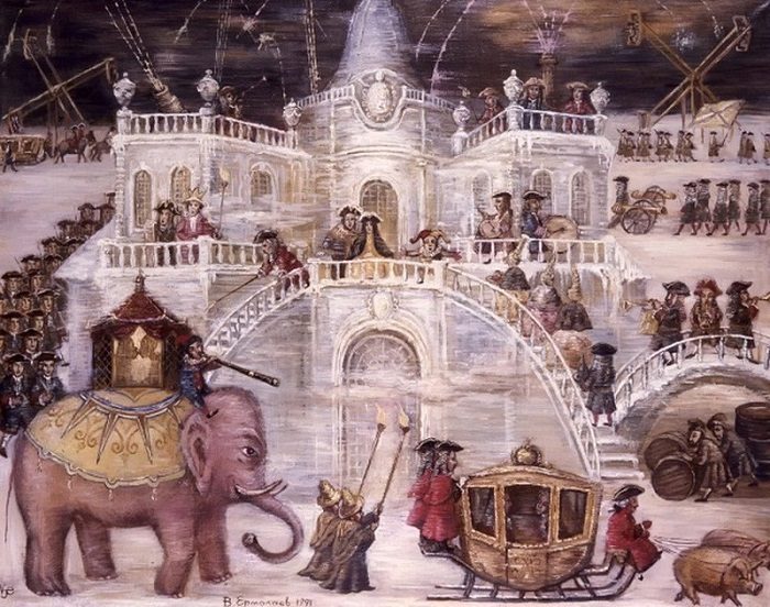По периметру ледяной дом украшали ледяные фигуры птиц и животных. Наиболее впечатляющим творением стал ледяной слон в натуральную величину. Днем из хобота выпускались струи воды, а ночью – горящей нефти.