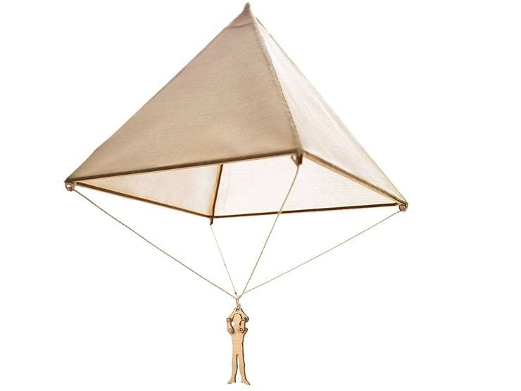 В 1483 году Леонардо да Винчи нарисовал эскиз пирамидального парашюта — «палатки» из накрахмаленного полотна размером 12х12 локтей. Как он сам обозначал, благодаря данному устройству человек мог упасть с любой высоты и при этом не повредиться. Удивительно то, что эти расчёты близки к размерам современного парашюта.