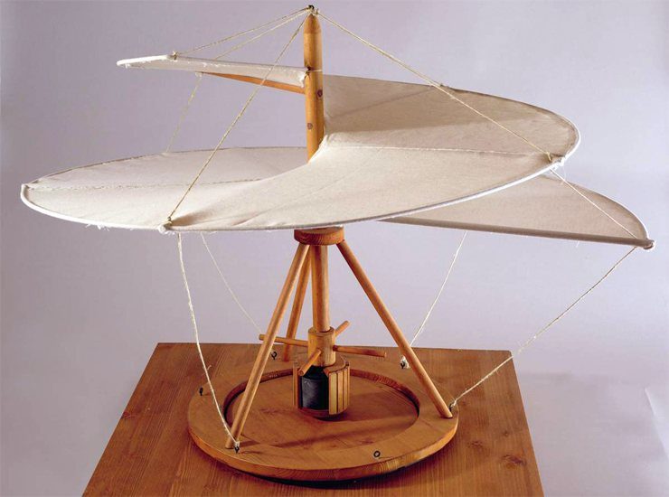 Это прототип современного вертолёта, у которого были «лопасти» и если придать им достаточной скорости то формировалось аэродинамическое давление, благодаря которому он мог взлететь. При наличии воздуха под лопастями воздушный винт поднимался на достаточно высокое расстояние, но лететь самостоятельно не мог. Винт приводился в движение людьми, которые шли вокруг оси и толкали рычаги.