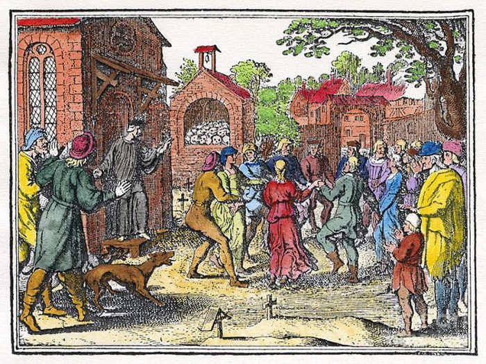 Это явление получило название «пляска святого Вита», или «хореомания». Зафиксировано множество случаев по всей Европе, но самое раннее – в VII веке. Хореомания могла начаться с одного человека, который начинал танцевать, даже несмотря на отсутствие музыки, затем к нему присоединялось все больше и больше людей, и они продолжали двигаться вместе, находясь в трансе по несколько часов, дней, иногда недель и даже месяцев. Чем дольше длилась пляска, тем суровее были последствия. Иногда танцующие просто падали, и моментально засыпали, и, проснувшись, возвращались в свое обычное состояние. Вывести танцующих насильно из их трансового состояния не получалось. Окружающим приходилось ждать, когда они закончат самостоятельно свои движения. Сердечные приступы, инсульты, обезвоживание, переутомление, голод – вот неполный список тех причин, которые в итоге могли действительно остановить танцующих. И в большинстве случаев эти причины приводили к смерти.