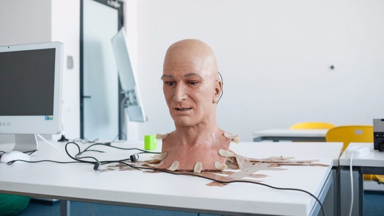 Робота «Гагарин» создали в Университете Иннополис. Он понимает речь, умеет общаться и пародировать собеседника. Воссоздать движения и мимику лица помогают 30 моторчиков.