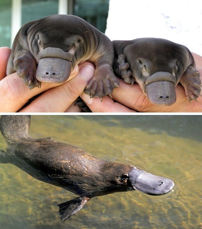 Уж утконоса даже слепой не спутает, да и остальные, честно говоря, легко идентифицируются. Вот кто действительно непохож на своих родителей так это гусеницы и личинки муравьев, колорадского и майского жука. Тут уж ничего не скажешь.