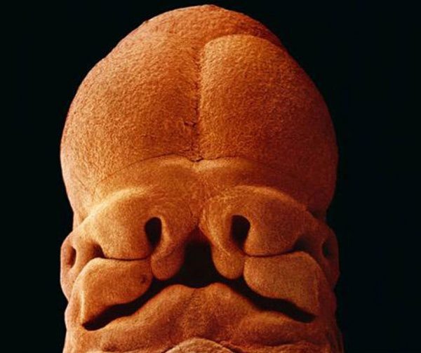 5 недель, длина 9 мм, уже угадывается лицо с отверстиями для рта, ноздрей и глаз.
