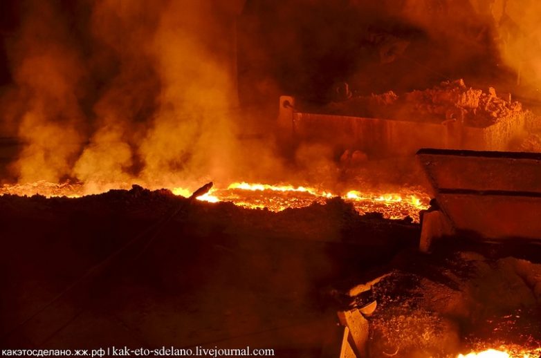 Далее чугун попадает в устройство для слива. Его разливают в огромные ковши, которые везут чугун по жд на следующий участок обработки. Человек в маске и в спецодежде – горновой, следит за тем, чтобы супчик не пригорел.