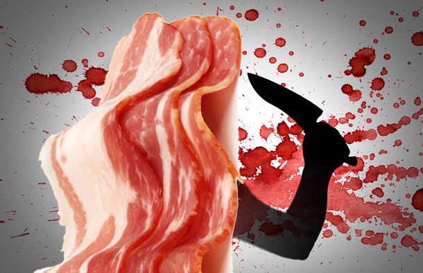 Знаете, что вегетарианцы из прошлого пункта поступают очень даже правильно, потому что, если ты не будешь уважать бекон, бекон придет, убьет тебя и сожжет твою квартиру. Ладно, насчет квартиры мы пошутили, а вот убить человека бекон может запросто. Первая зарегистрированная смерть от бекона произошла в 1543 году, когда некая кухарка Элизабет Браун грелась на кухне у очага, как вдруг на нее внезапно упали четыре огромных ломтя сырого бекона и раздавили ее насмерть. Ломти свисали с потолка на крюках и упали Элизабет прямиком на голову, когда один из удерживавших их канатов неожиданно оборвался.