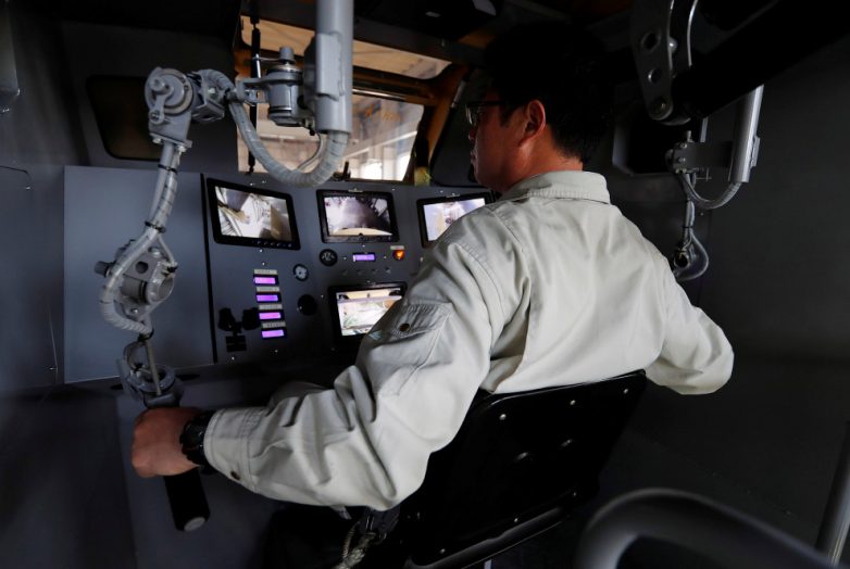 Кабина управления с мониторами и рычагами. (Фото Kyung-Hoon):