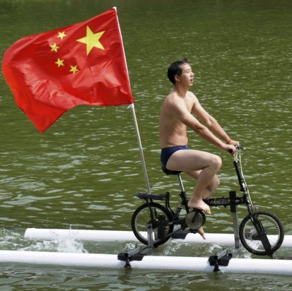 Пластиковые водопроводные трубы плюс старый велосипед — равно это необычное средство передвижения. Не забыл изобретатель и про государственный флаг. Китайских умельцев, как ты увидишь ниже, вообще отличает патриотизм.