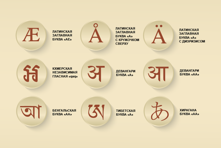 А это тоже буквы для [а] или близких к нему звуков в других системах письма, не связанных с финикийской: в кхмерской — ឣ, в санскрите — अ или आ, в бенгальской — আ, в одном из вариантов японской — あ.