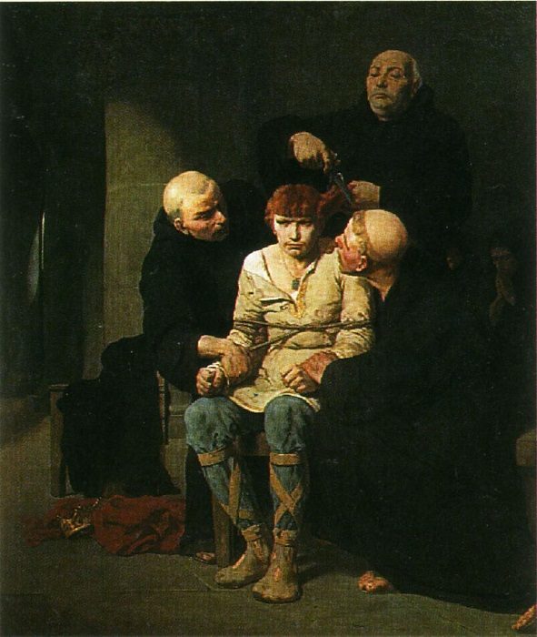 Низложение последнего из Меровингов сопровождалось унизительным для королей этого рода острижением волос. Картина: Эварист Виталь Люмине.