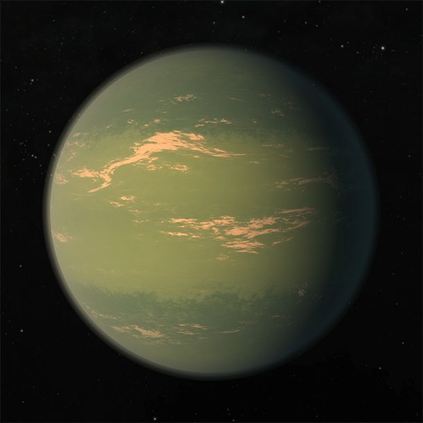 Эта планета обращается вокруг своей оранжевой карликовой звезды за 101 день. Некоторые считают, что она состоит из газов. Если это так, то она не пригодна для жизни. Но кто знает, может быть, ее поверхность окажется твердой.