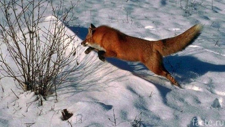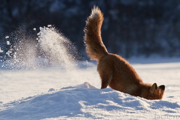 Однако с приходом зимы жить им становится сложнее. Грызуны начинают зарываться в снег, затрудняя лисам охоту. Так как они не умеют подкрадываться к своей добыче, им приходится прибегать к тактике под названием «мышкование». Они подпрыгивают в воздух, приземляются в снег и вытаскивают оттуда вкусных зверюшек прежде, чем те успеют убежать. Это захватывающее зрелище, но возникает интересный вопрос – если грызуны находятся под снегом, как же лиса узнает, куда прыгать?