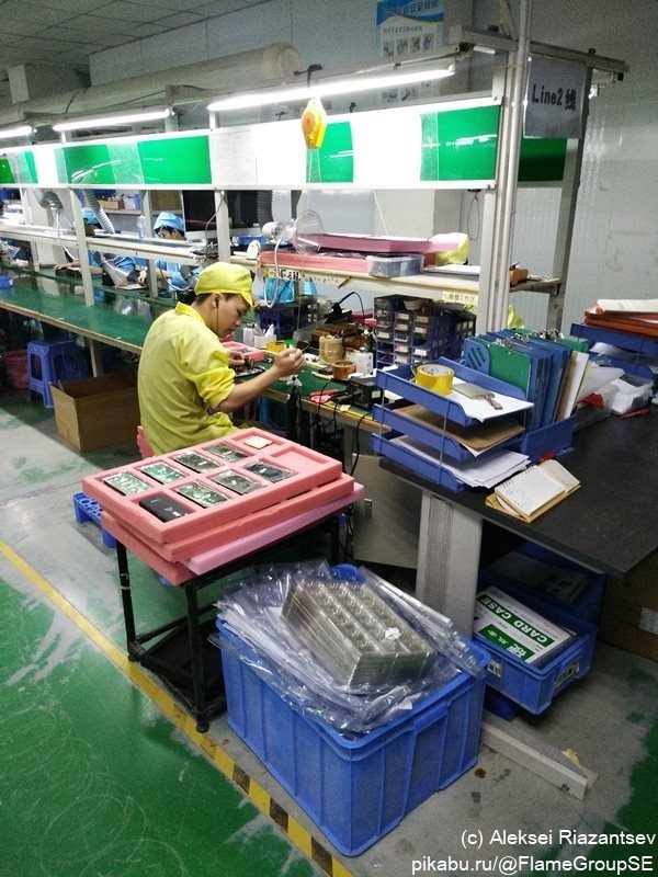 Общая панорама линии сборки – кто-то прикрепляет компоненты к плате/корпусу, кто-то тестирует устройство и компоненты. У всех есть простой алгоритм работы. Обязанностям все рабочие обучались непосредственно на фабрике. Никакой специальной квалификации ранее у них не было. Образования — тоже.