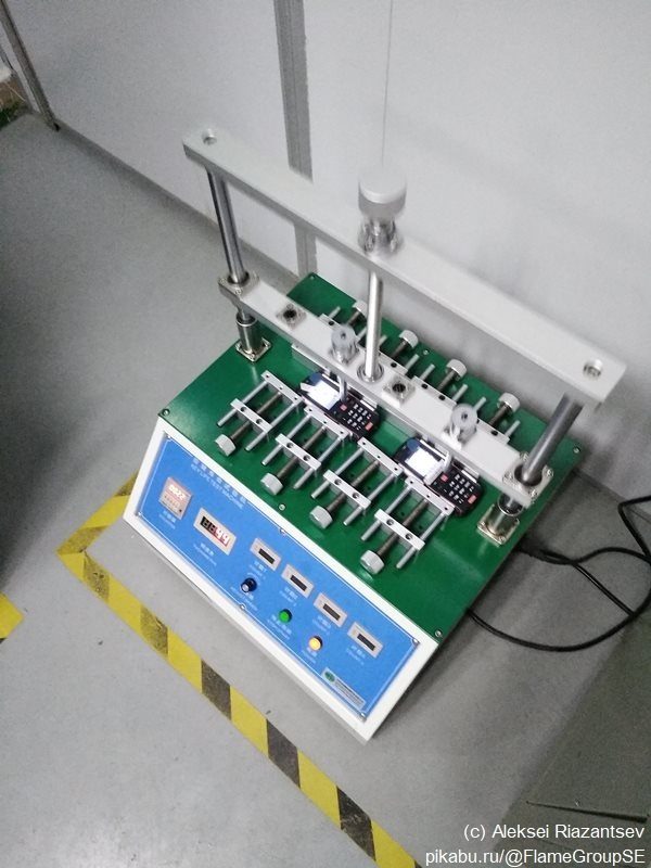 Агрегат слева, например, проверяет устойчивость USB-кабелей, а агрегат справа – это духовой шкаф, который нагревает устройства до температуры 60 градусов. Фабрика следит за тем, чтобы поставщики не прислали бракованные компоненты, которые не выдержат заявленных условий.