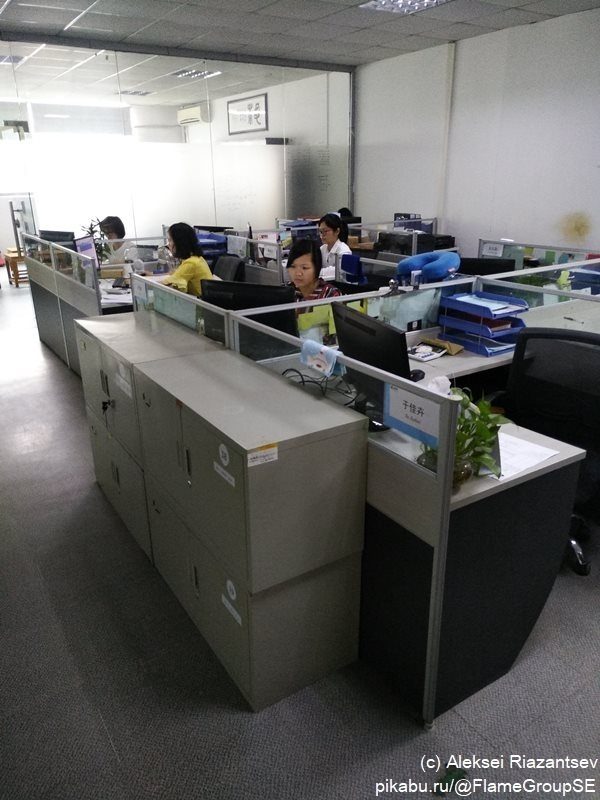 А это отдел сервиса. Они ремонтируют и тестируют устройства на предмет багов. Идеальной электроники не бывает. В сервисе стерильная чистота уже не является обязательной. Сотрудники трудятся в обычной одежде.