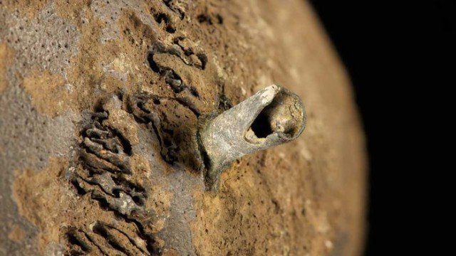 Часть черепа с бронзовым наконечником, надеюсь его обладатель умер мгновенно.