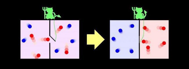 Впрочем, возможно, не все так необратимо. Есть подводный камень, которого не замечают многие люди, узнавая о втором законе термодинамики и увеличении энтропии: это касается только энтропии закрытой системы, или системы, на которую ничто не воздействует извне, а энтропия не убывает и не добавляется. Впервые эту идею попробовал раскрыть физик Джеймс Клерк Максвелл еще в 1870-х годах: достаточно иметь внешнюю сущность, которая открывает ворота между двумя сторонами комнаты, позволяя “холодным” молекулам протекать в одну сторону, а “горячим” — в другую. Этот мысленный парадокс стал известен как «демон Максвелла», и он на самом деле позволяет уменьшить энтропию системы.