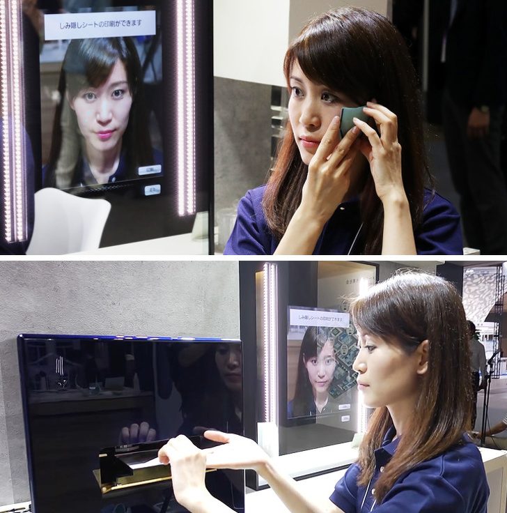 На рынке уже много «умных» зеркал, которые показывают погоду, новости и прочее, но компания Panasonic предложила куда более сложное устройство с медицинским направлением. Зеркало считывает текстуру кожи, определяет возможные недостатки (неровный цвет лица, шрамы, акне) и через принтер отправляет на печать макияжную маску, которой можно будет «заклеить» различные недостатки.