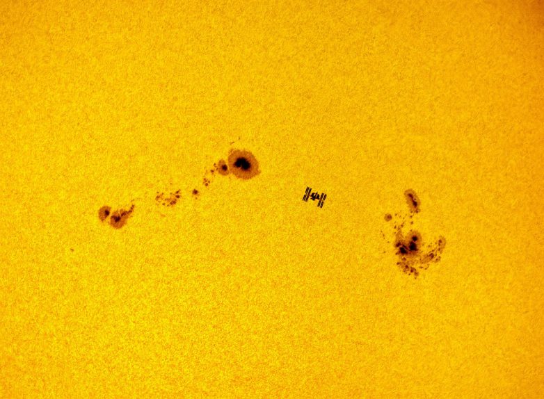 13. Международная космическая станция на солнечном диске с солнечными пятнами. (Фото Dani Caxete):
