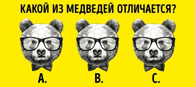 Речь идет не о простых картинках из детских журналов, а о более сложных упражнениях, предназначенных для взрослых.Мы составили для вас один из вариантов подобной задачи. Попробуйте найти на картинке медведя, отличающегося от остальных. Засеките время, чтобы узнать, как быстро вам удалось справиться с заданием (ответ мы дадим в конце статьи).