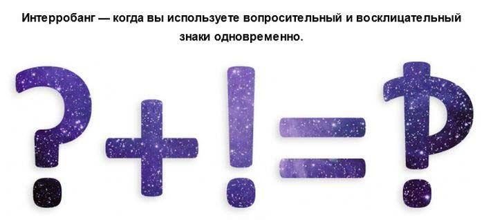 Этот специальный знак еще называют «единорогом» современной пунктуации. В последнее время интерробанг приобретает все большую популярность. Такой знак вполне можно заменить комбинированным написанием вопросительного и восклицательного знаков «?!», но интерробанг выглядит более эмоционально и выразительно.