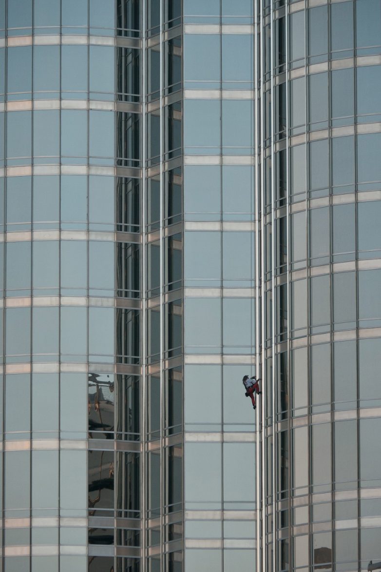 В то время, как все главные природные вершины покорены, французский скалолаз Ален Робер взялся за вершины, созданные человеком. И вошел в Книгу рекордов Гинесса в качестве покорителя небоскребов. На счету «Человека-паука» более 70 восхождений на самые высокие строения в мире, среди которых Эмпайр-Стейт-Билдинг (Нью-Йорк), Эйфелева башня (Париж), Башни Петронас (Куала-Лумпур), Тайбэй 101 (Тайбэй) и главное здание МГУ (Москва).Ален Робер по прозвищу Человек-паук покоряет самое высокое в мире здание Бурдж-Халифу (828 м):