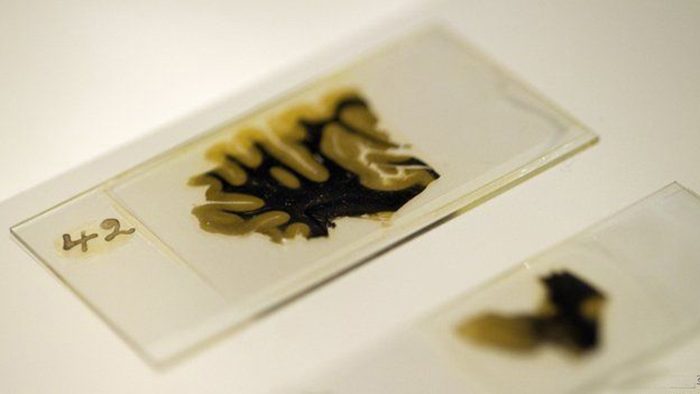 Харви сфотографировал мозг со всех возможных углов, а затем осторожно разрезал его на 240 небольших кусочков, каждый из которых упаковал в банку с формалином или в коллоидную пленку.