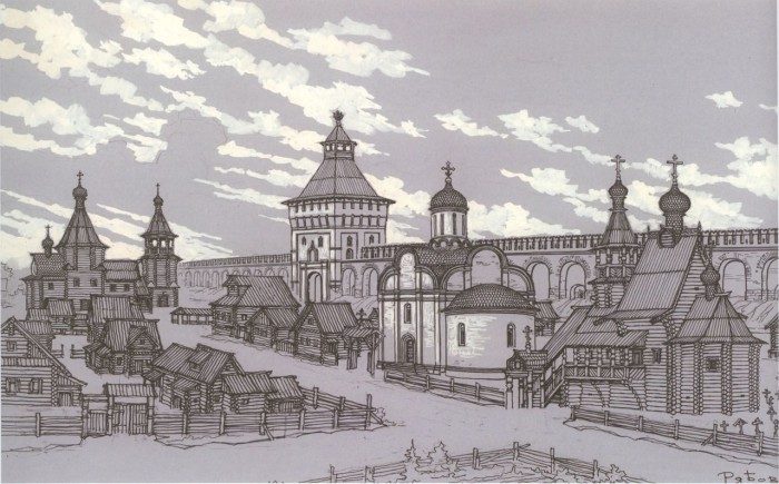 У Арбатских ворот Белого города в начале XVII века. Реконструкция В. А. Рябова.