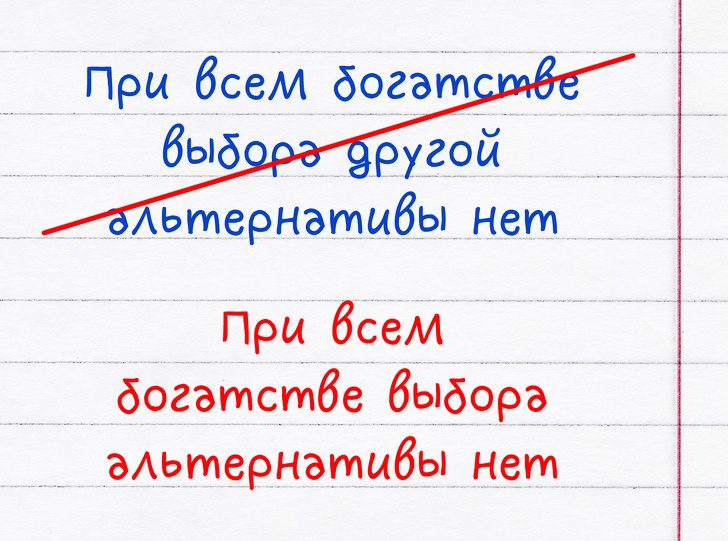 Помните рекламу из 90-х, в которой звучала эта фраза? Это классический пример плеоназма, и вот почему: в переводе с латыни слово «альтернатива» обозначает «другой», то есть, употребляя выражение «другая альтернатива», мы говорим не что иное, как «другая другая».