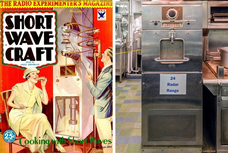 Заметил нагревающую способность СВЧ-волн американский инженер Перси Спенсер в 1946 году и запатентовал печь, первая из которых была в человеческий рост и весила 340 кг.