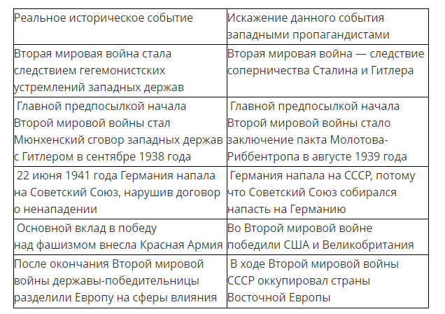 Сюжетов, тем и событий, подвергающихся замалчиваниям и искажениям со стороны западных историков и политиков, — великое множество. И ключевыми из них давно стали те, что обозначены в нижеприведенной таблице.