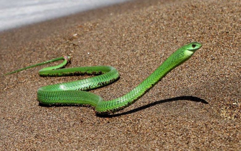 Ареал обитания – тропические леса Западной Африки. Средняя длина – 2 метра, но встречаются и более крупные особи. Они отличаются особой изящностью, продолговатая голова не сливается с туловищем, как у большинства змей. Окрас преимущественно зеленый. Чем старше рептилия, тем темнее цвет ее кожи. Змеи эти очень красивы, но приближаться к ним ни в коем случае нельзя. Зеленые мамбы обитают в лесах, но в последнее время зарегистрированы случаи их появления на чайных плантациях и даже в городских парках. После ее укуса человек проживет максимум полчаса, так как яд этой змеи приводит к параличу и некрозу. Но она очень пуглива, если ее не беспокоить, она не принесет вреда.