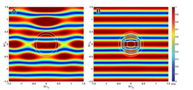 Изображение взаимодействия света с полой кремниевой сферой (А) и с той же сферой, но наполненной трехслойным веществом для придания невидимости (В)