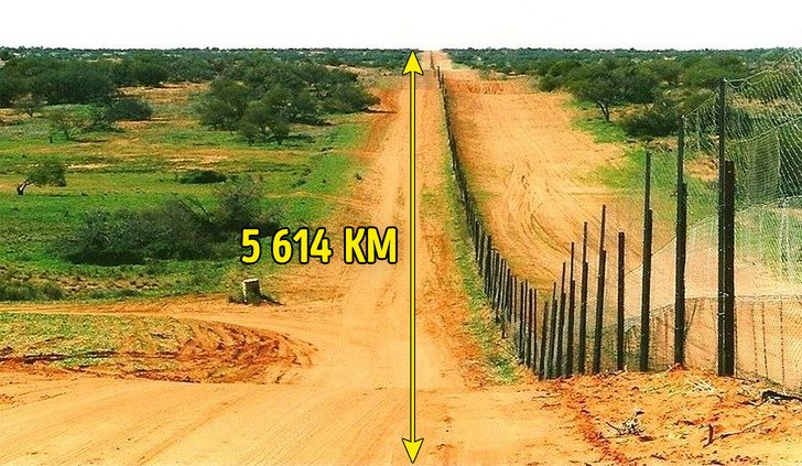 В XIX веке в Австралии овцеводство было важной отраслью экономики. В 1880-х фермеры решили выстроить длинный забор, который защищал бы овечьи пастбища от нашествий диких собак динго. Этот забор имеет протяженность 5 614 км. Для сравнения, протяженность российско-китайской границы — 4 209,3 км.