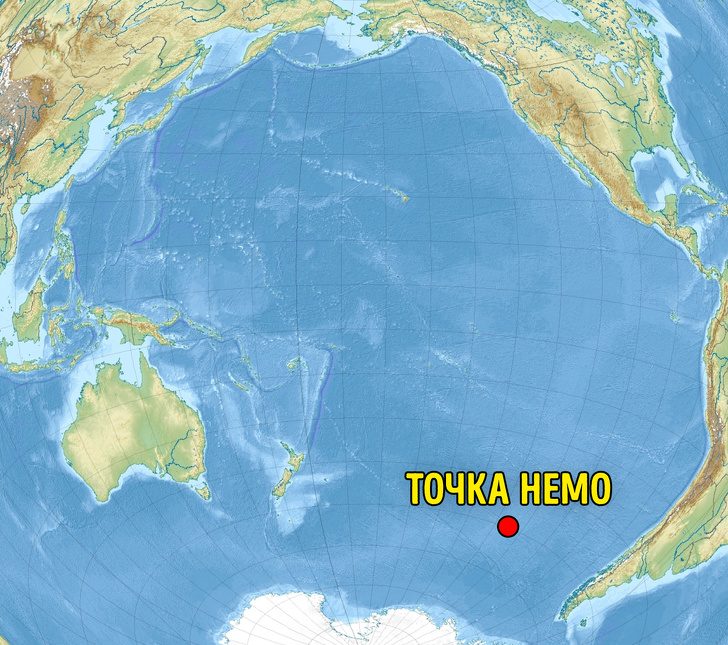 В Тихом океане есть условная точка, которая наиболее удалена от какой-либо суши. Ближайшая к ней земля находится на расстоянии 2 688 км. Это место еще называют полюсом недоступности. Ближайшие «кусочки» земли — это необитаемые атолл Дюси, остров Моту-Нуи и остров Махер.Свое название точка получила благодаря герою романа Жюля Верна «20 тысяч лье под водой».