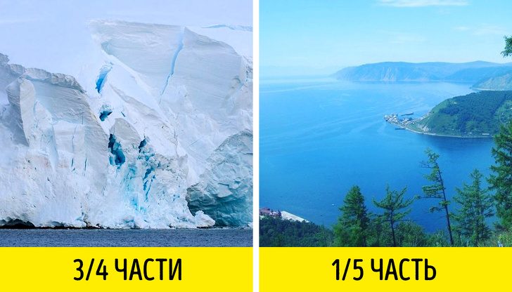 Около 10 % поверхности нашей планеты покрыто льдом. Ледники покрывают 15 млн кв. км Земли. И в этих 10 % содержится 75 % всей питьевой воды на Земле.А вот если рассматривать только незамерзшую питьевую воду, то окажется, что целых 20 % ее содержится в одном лишь озере — Байкале.