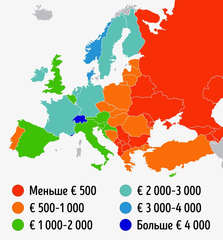 Самые низкие зарплаты зафиксированы в Азербайджане и на Украине (менее € 300 евро), самые высокие — в Дании, Норвегии, Люксембурге, Исландии и Швейцарии (больше € 3 000).
